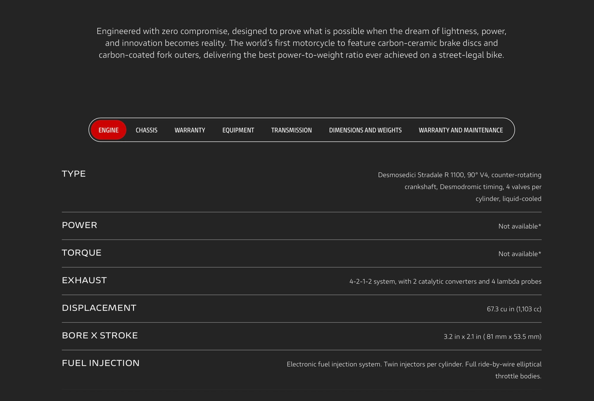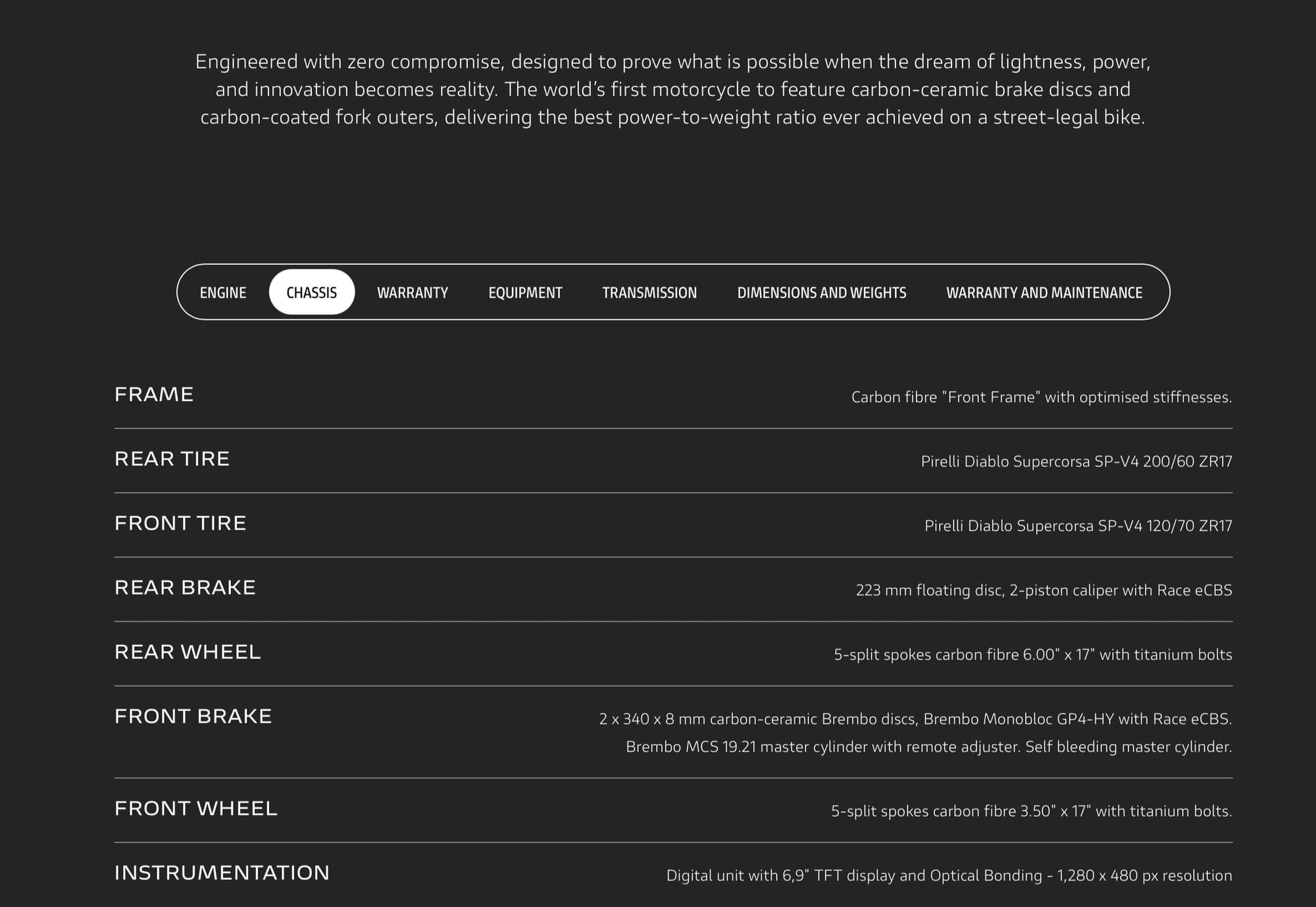 - Carbon-Ceramic Braking: For the first time on two wheels, Brembo carbon-ceramic discs (340mm) come standard. They slash unsprung weight by 900g per set and cut rotational inertia by 40%. The agility this provides on corner entry is massive.